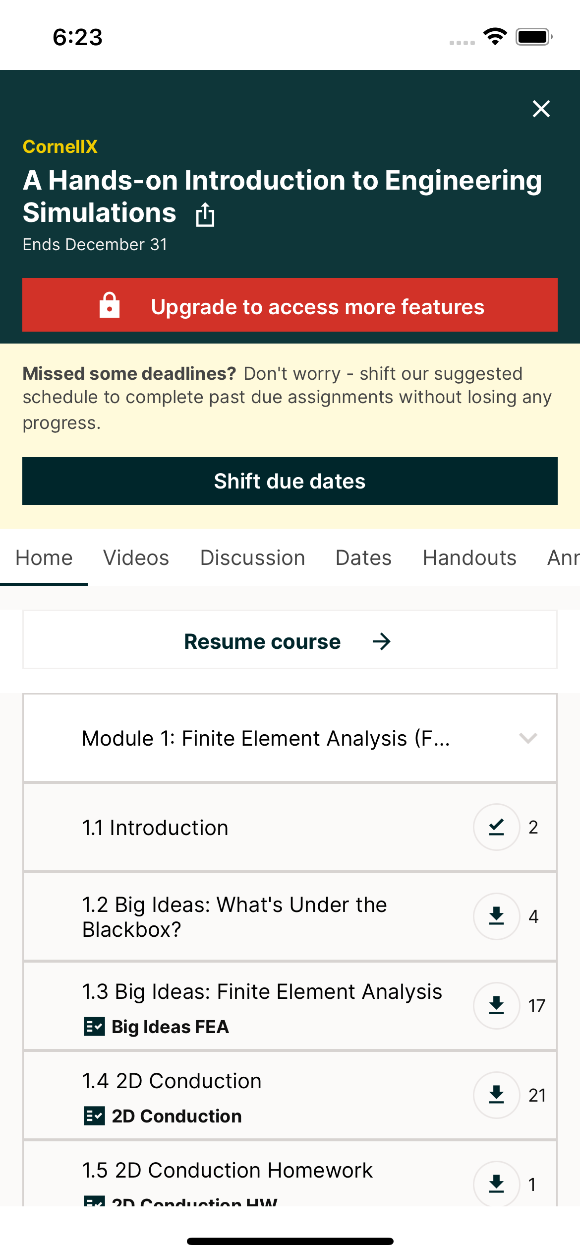 Course cards show the course thumbnail, information about the course, and the ability to upgrade to a paid track or view/begin a course (if applicable). Further course actions (e.g. unenroll, email opt-out settings, and social media share) have been moved to the menu/triple dot icon on the course card.