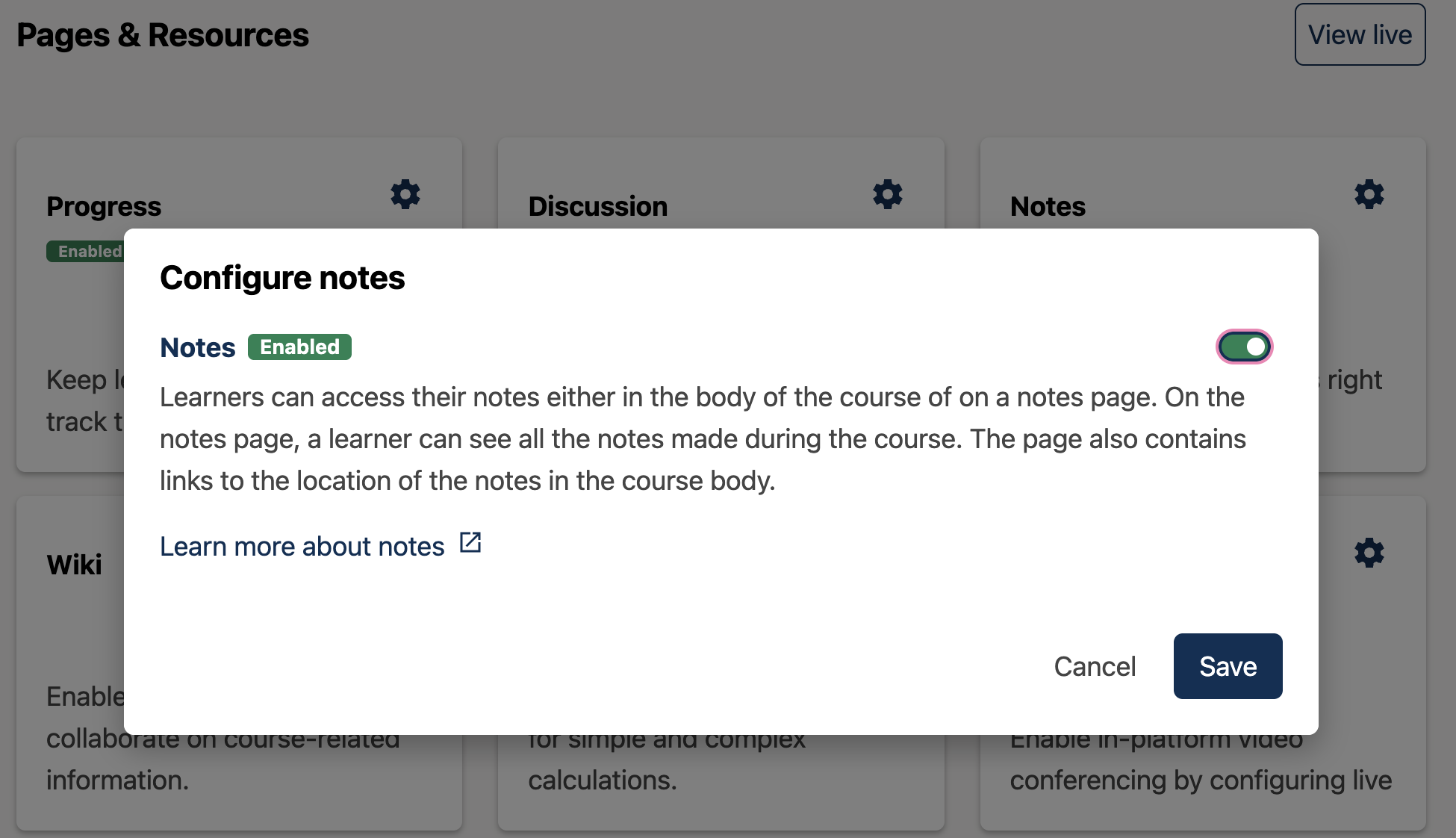 From the Configure notes modal, select the toggle to enable or disable the notes application.