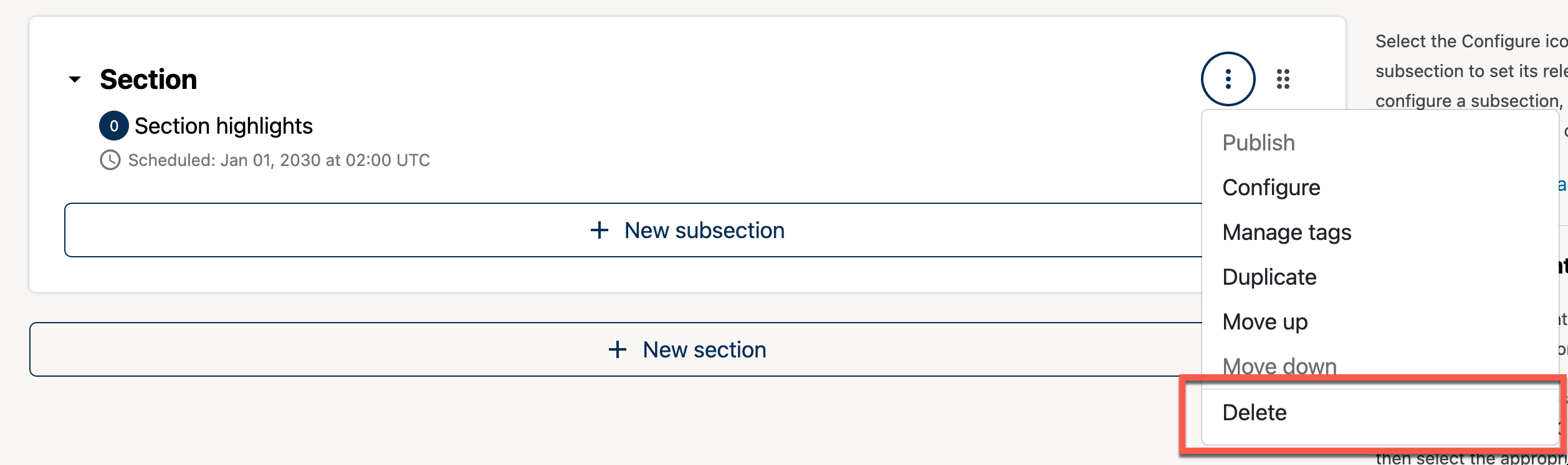 Select the Delete option from the kebab menu of the section that you want to delete.