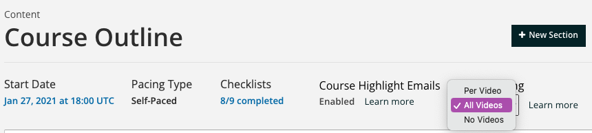 The course outline will have a new selector near the top of the page, labeled “Video Sharing”. This control enables you to manage how video content in your course will be shared. Options are: