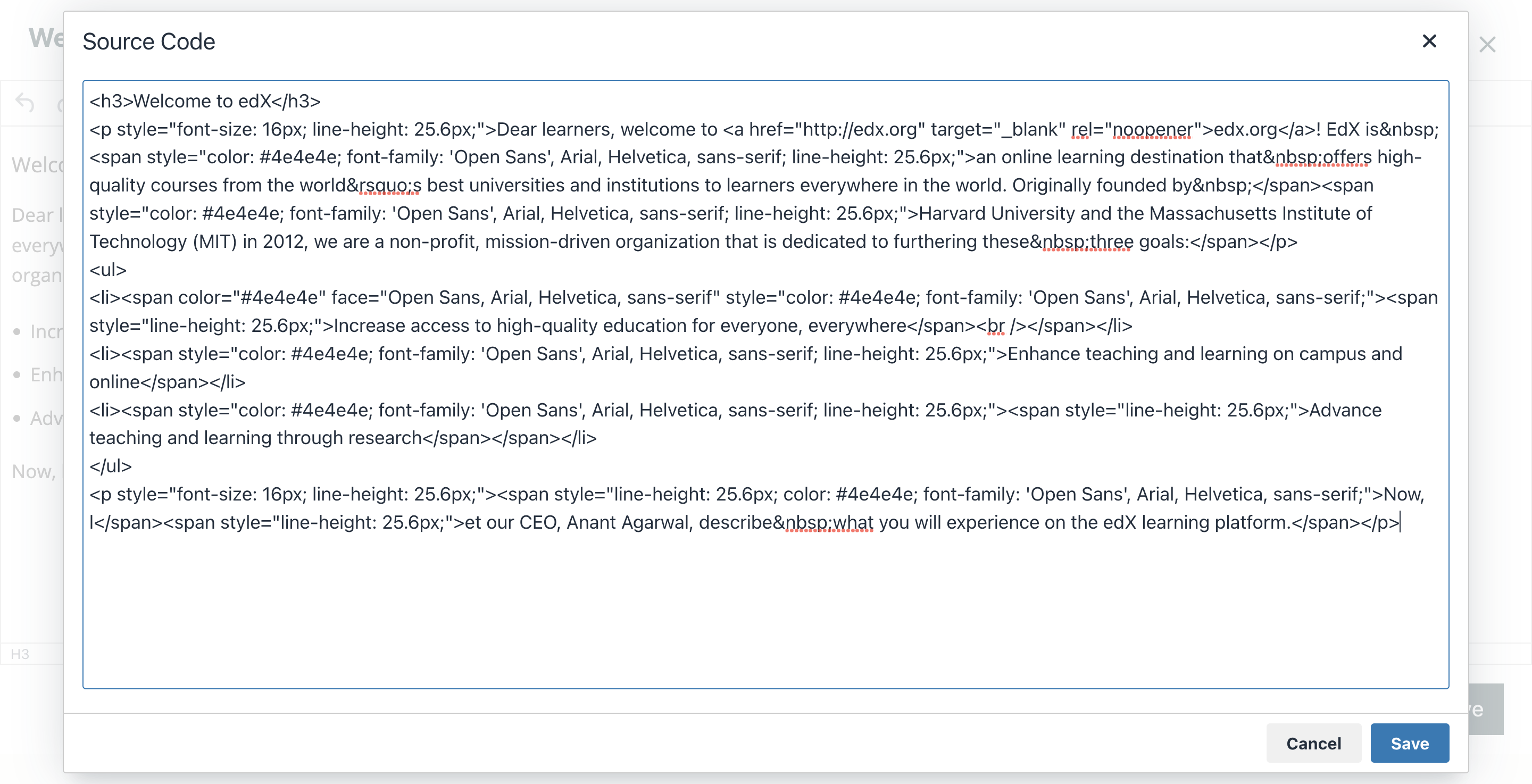 When you use this editor, you must supply valid HTML. The raw HTML editor does not validate your HTML code. If you use this editor, you should thoroughly test the HTML content in your course.