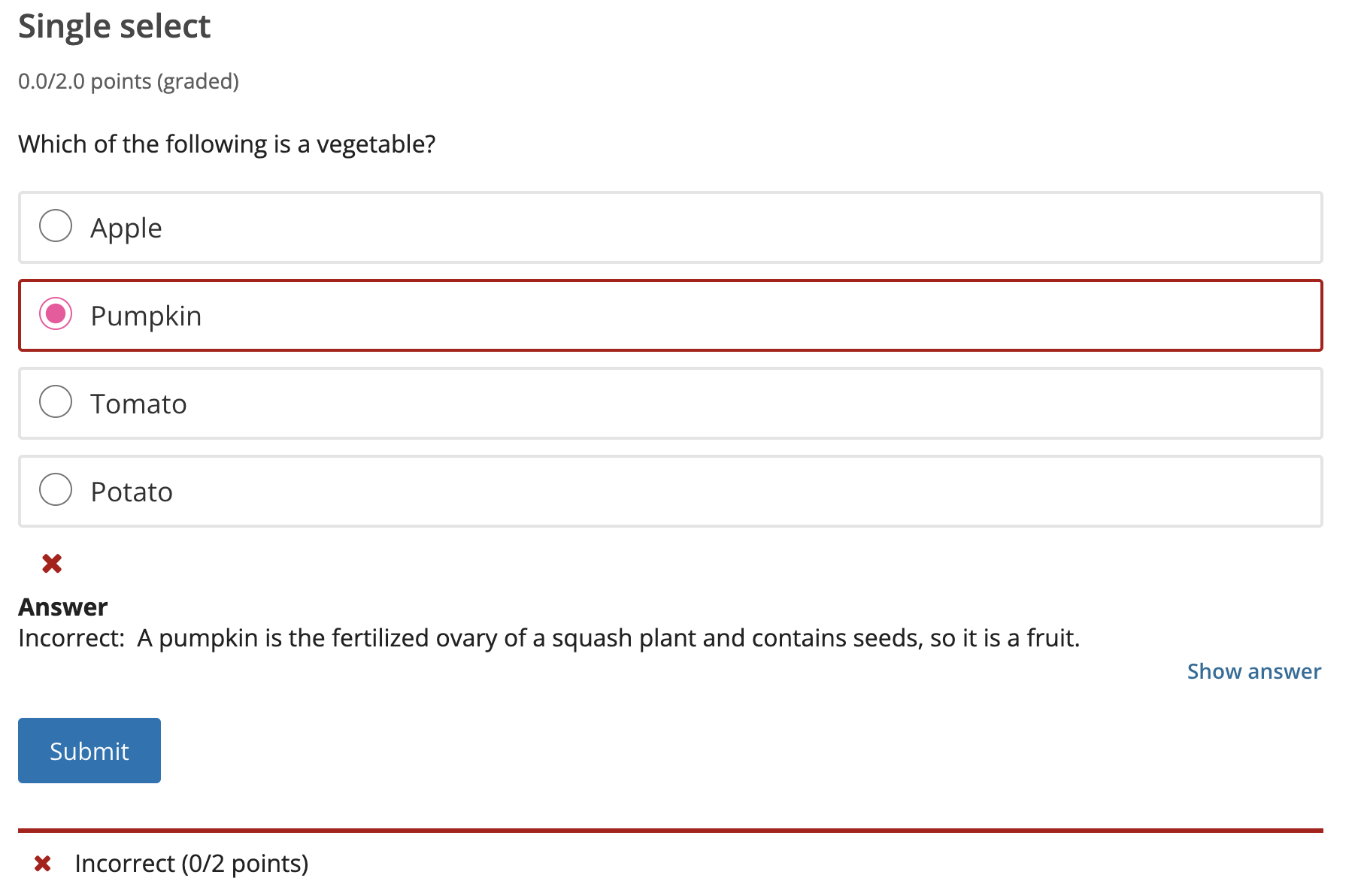 For example, the following single select problem provides feedback in response to the selected option when the learner selects Submit. In this case, feedback is given for an incorrect answer.