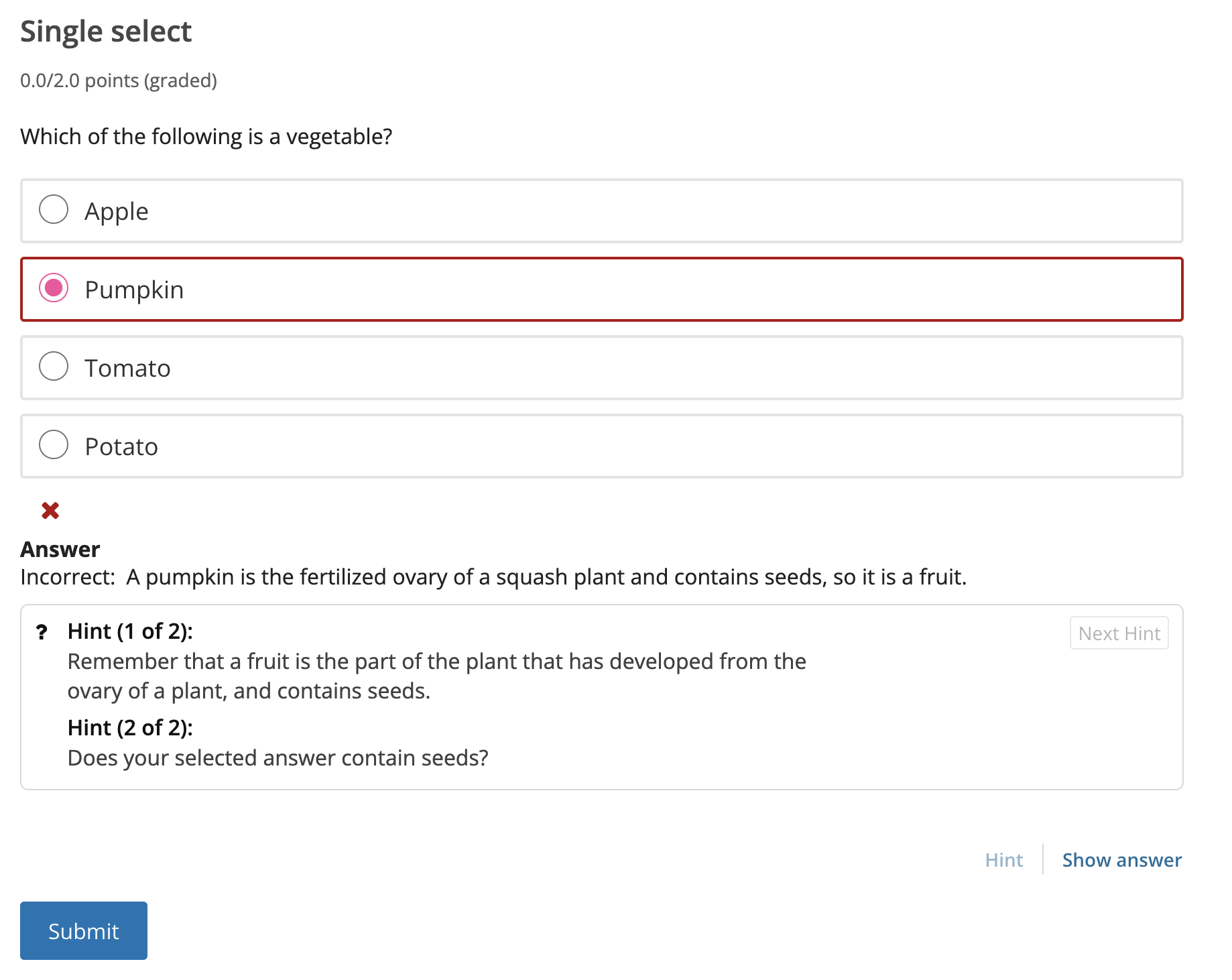 For example, in the following single select problem, the learner selects Hint after having made an incorrect attempt.