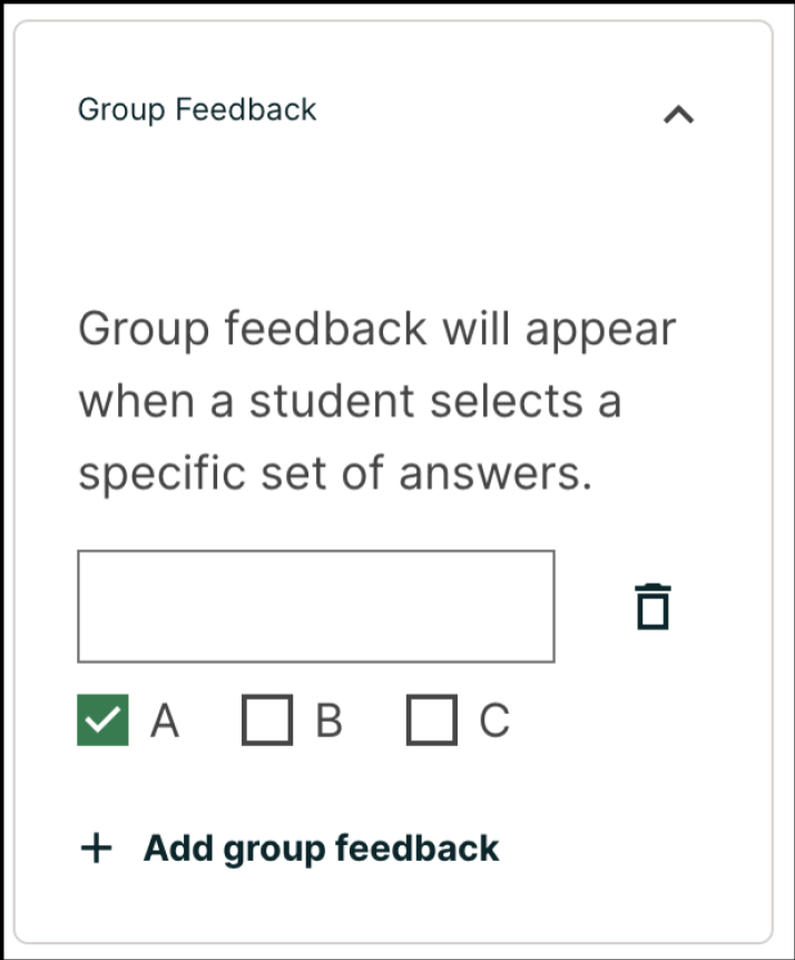This setting can be found on the collapsible settings to the right of the problem editor. Feedback entered in this field will display if and only if the learner selects all of the checked answers. Click the Add group feedback button to add additional feedback for different groups of checked answers. Group feedback can only be applied for the multi-select problem type.
