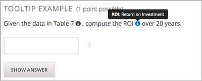You can add inline tooltips to help learners understand terminology or other aspects of a problem. Tooltips display text to learners when they move their cursors over a tooltip icon.