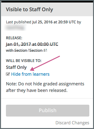 When you hide a unit from learners, the unit’s publishing status changes to Visible to Staff Only.