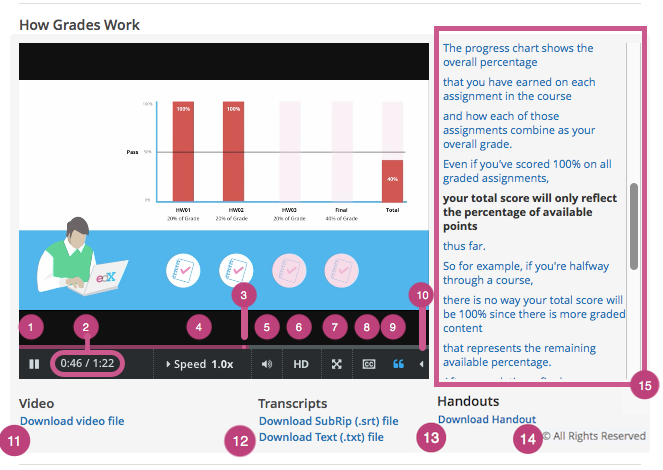 Handouts: You can download any handouts that the course team has associated with the video.