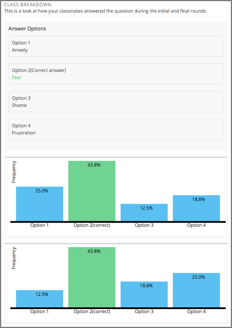 Use the graphs to compare the percentage of your fellow learners who selected each answer. The first graph shows the percentage of learners who selected each answer initially, and the second graph shows the percentage of learners who selected each answer after they had the opportunity to review the explantions that other learners provided. Compare your own choices, and the correct one, to your peers’.