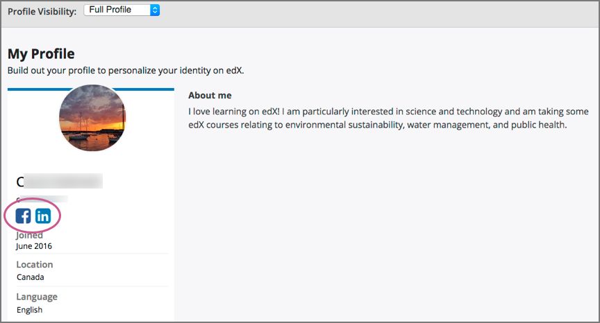 When you view your profile, icons for the social media icons that you added links for appear below your username. Other learners or course team members can click those icons to visit your social media account page.