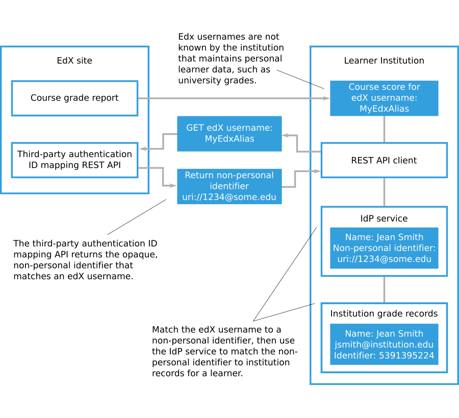 The following diagram shows how an organization that uses third-party authentication can match non-personally identifying Open edX learner usernames with the records that the organization holds for those learners.